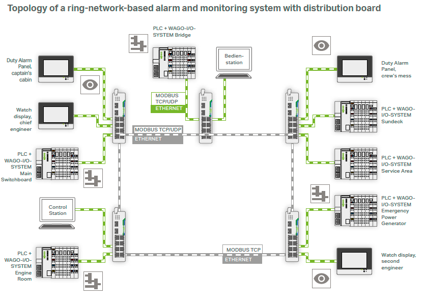 WAGO mevcut teknolojileri ile bir deniz aracındaki neredeyse her noktaya uygulanabilir; hareket kontrol otomasyonu, estek ve güverte makinaları, navigasyon ve haberleşme teçhizatı vb. Her uygulamanın kendine özgü gereksinimleri vardır. Süregelen tüm bu gereksinimleri karşılamak için; WAGO röleleri, optokuplörler, sinyal çeviriciler, güç kaynakları ve endüstriyel switchler gereklidir. TOPJOB S ray klemensleri, 0,08 ila 185 mm² arasındaki iletken boyutları ile deniz uygulamalarında elektrik bağlantı teknolojisi için geniş bir platform oluşturur. 400’den fazla modül içeren WAGO 750 I/O sistemi, BSH gibi özel sertifikalara da uyumluluğu ile baştan sona bir geminin tüm gereksinimlerini karşılamaktadır.
